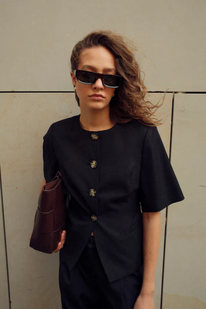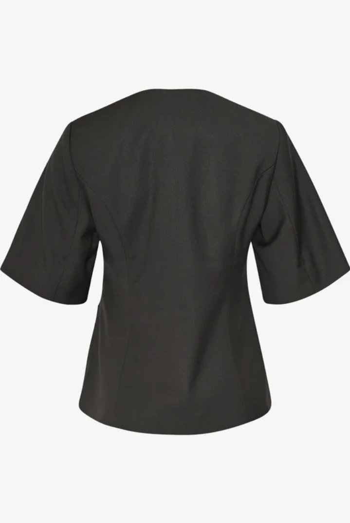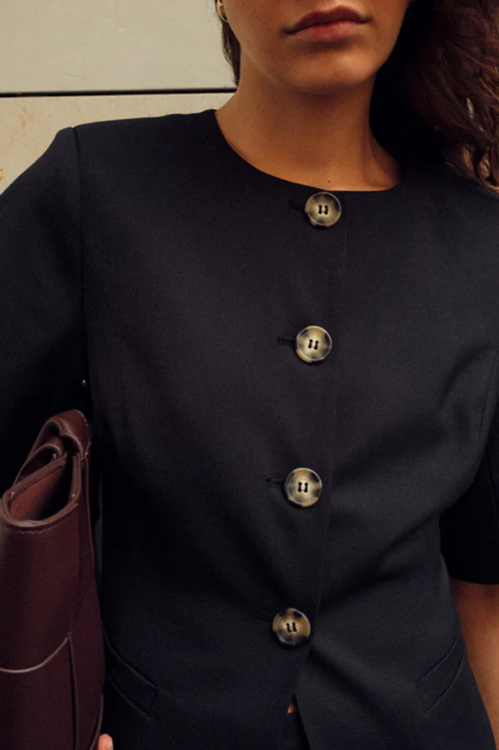 Kasundra Blazer fra Noella. Cool blazer fra Noella med et feminint snitt. Kasundra Blazer har rund hals, korte ermer og innsvinget midje. Blazeren har fine knapper og lommer i front. Denne er perfekt til både hverdags og fest - stylet med en jeans eller satengskjørt, eller med matchende Kazia Pants for en full look.