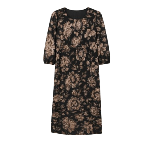 Kjolen er mørk bunn med et lekkert blomsterprint på plissert stoff. 3/4 dels ermlengde og knelang lengde på skjørtet. Kjolen er foret med et sort og strechy for.