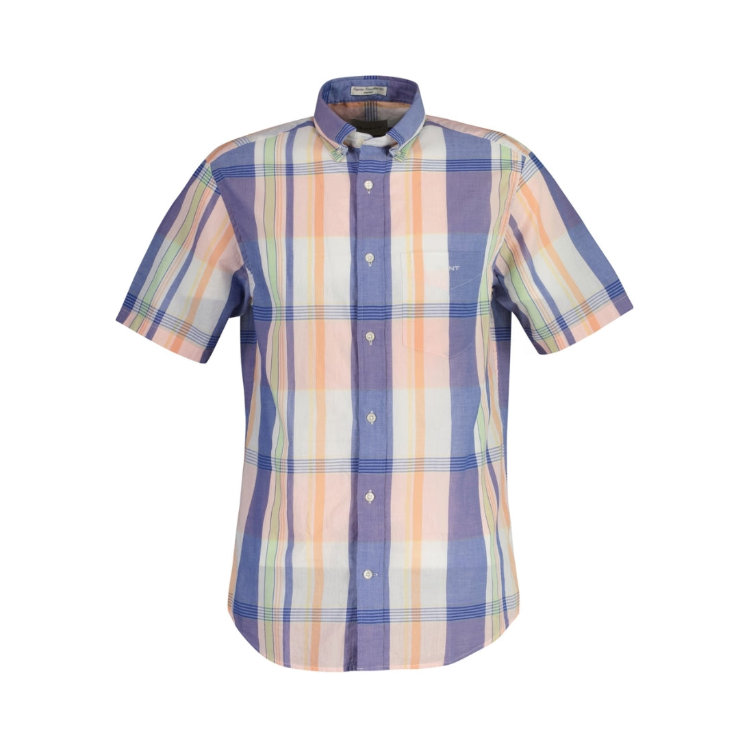 Crafted from 100% cotton, this shirt is cut for a regular fit and adorned with an all-over indigo madras checked pattern. Detailed with a GANT logo embroidered at the chest pocket, the design features a button-down collar, adjustable cuffs, a curved hem, and a box pleat with our signature locker loop at the back.