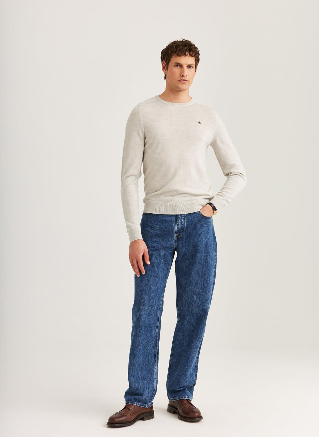Morris Classic Crew Neck Sweater er selve grunnpilaren i enhver manns garderobe. Strikket i eksklusiv 100% merinoull som er kjent for sin mykhet, pusteevne og temperaturregulerende egenskaper. Dette gjør genseren behagelig å bruke året rundt – like komfortabel på kjølige høstdager som på milde vårkvelder.