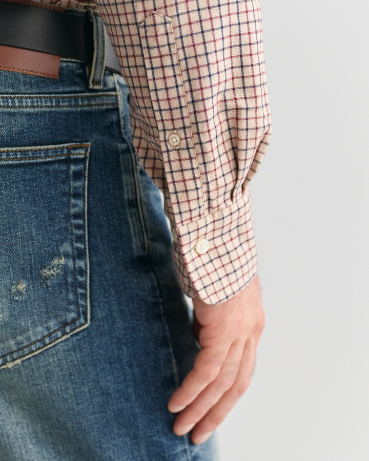 Skjorte designet med et rutemønster. Skjorten er laget av lett twillstoff i bomull og har en klassisk krage med knapper, justerbare mansjetter og en avrundet bunn. Skjorten er dekorert med resirkulerte polyesterknapper, samt et brodert GANT-skjoldemblem på brystlommen og en innebygd plissé med den karakteristiske GANT-løkken bak.