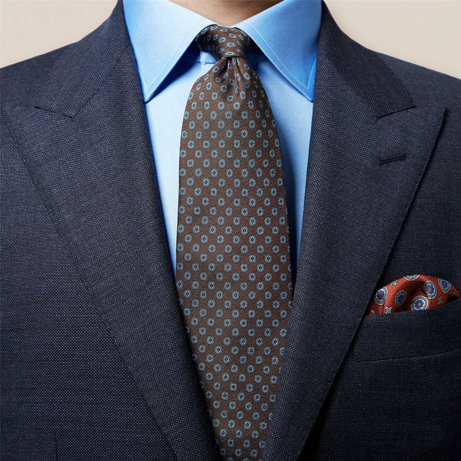 The perfect tie for the office. The smooth handling and lightweight feel make it work for all seasons. The soft draping of the silk allows for a tighter knot if you prefer. Crafted from pure silk with a versatile geometric print in vibrant colours. Wear it with a classic striped shirt, a matching pocket square and a trim suit for a modern business look. 100% silk, made in Italy. Size 80 mm / 3,15".
