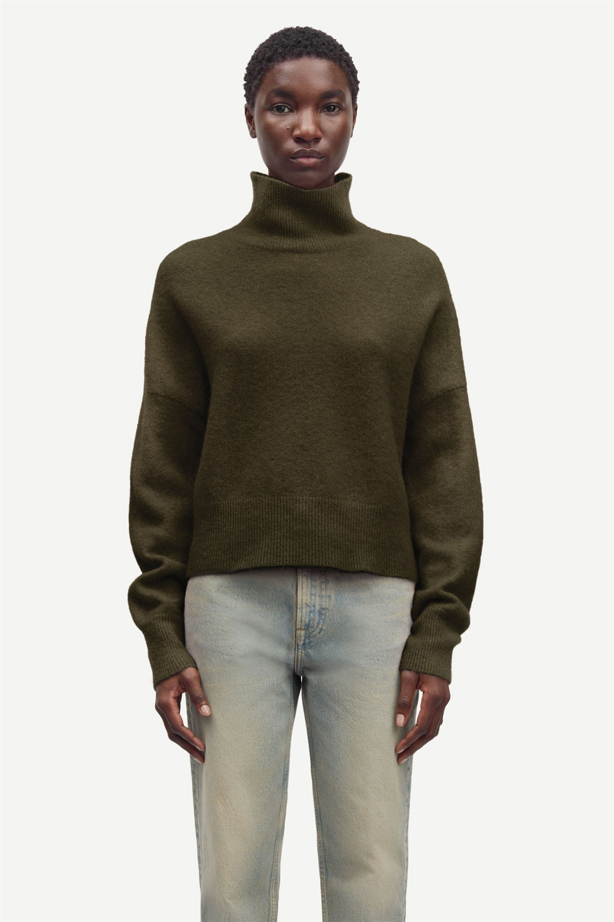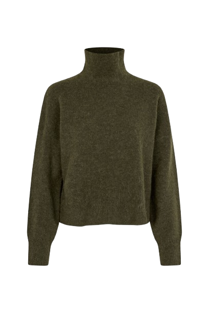 Høyhalset genser med normal passform og droppede skuldre. Genseren har ribbestrikket hals, mansjetter og nederkant, samt fully fashioned-sømmer som gir et raffinert uttrykk.