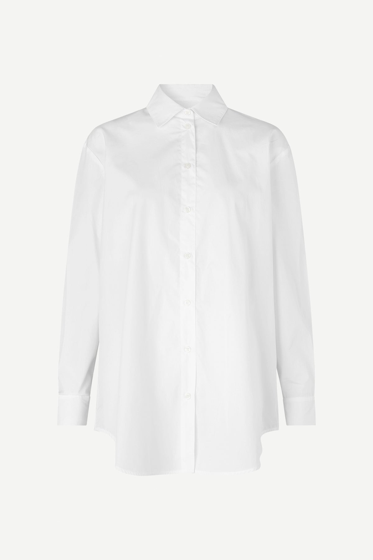 Relaxed fitting long sleeve shirt. Curved hem with elongated back length. Back neck yoke seam with pleat. 100% organic cotton fabric.
