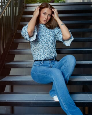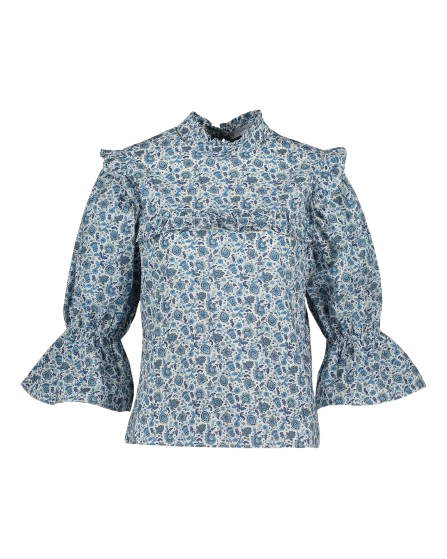 Topp i lett bomull med blomsterprint og paisleymønster som gir den en stilig look. Den har høy hals med volangkant øverst og knapp i nakken med nøkkelhullsåpning. Volangdetaljer over skuldrene og brystet gir toppen et ekstra pent uttrykk.