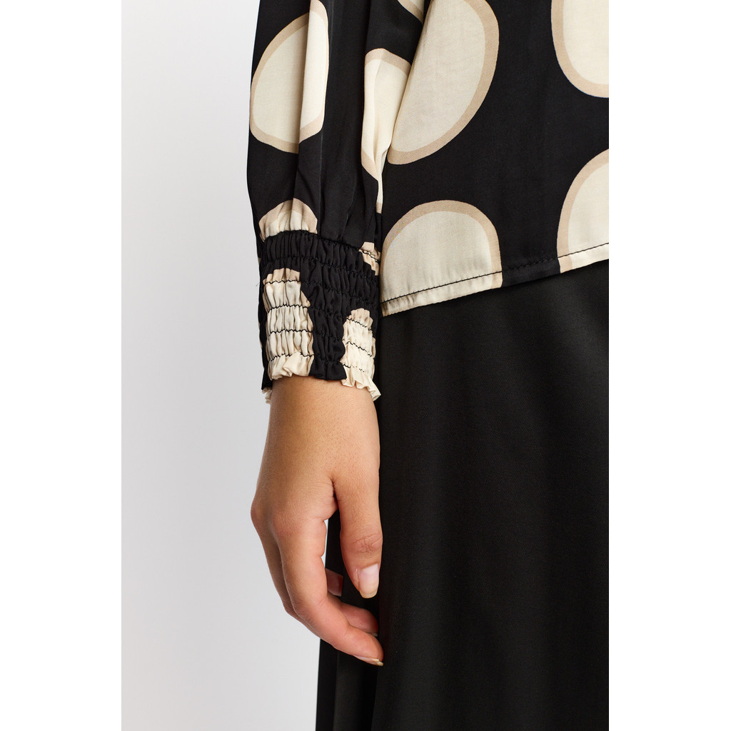 Toppen har lange ermer med smock nederst, rund hals og forekommer som normal i størrelsen.